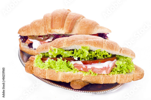Croissant sandwich with salted salmon on plate,