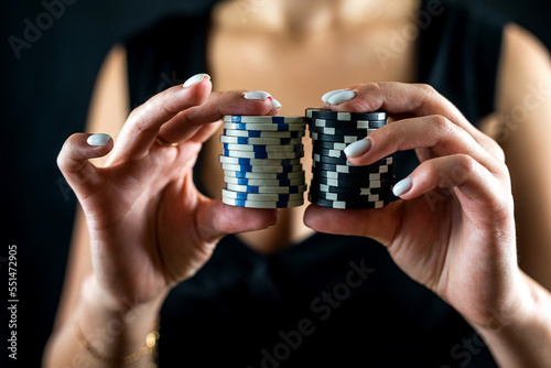 cropped portrait of woman in black dress holding chips in front of cleavage for gambling.