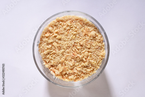 Crushed hazelnut pieces in a glass bowl