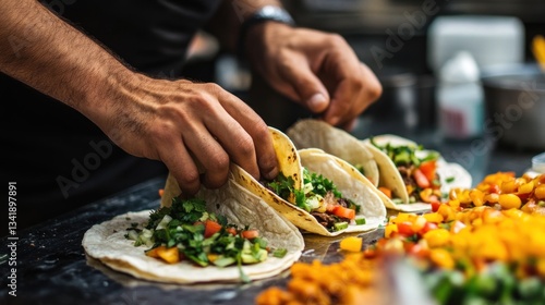 Culinary artistry: Chef preparing vibrant tacos with fresh ingredients for a delightful experience