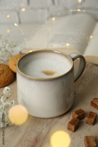 Cup of coffee, brown sugar and cookies on wooden table, bokeh effect