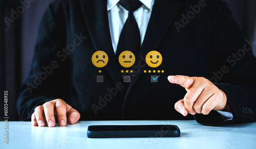 Customer Satisfaction Survey concept, 5-star satisfaction,service experience rating,ISO certification and standardization concept., satisfaction feedback review, good quality most.