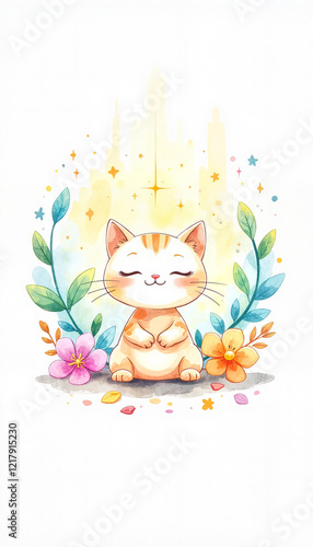 Cute cartoon cat smiling surrounded by colorful flowers. Yoga cat on sunrise.