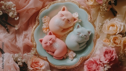 Cute Cat Figurines on Floral Plate
