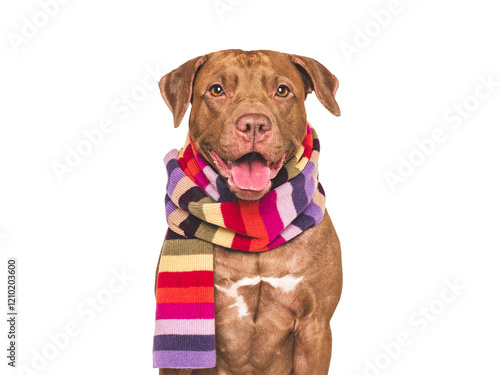 Cute dog and knitted winter scarf. Closeup, indoor. Studio shot. Pet beauty and fashion concept. Pets care