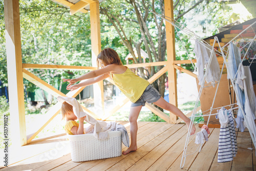 Cute European sibling children hang laundry together on veranda in backyard in summer. Helping children with household routines, relationships and sibling games in family