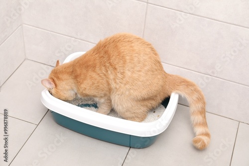 Cute ginger cat in litter tray indoors