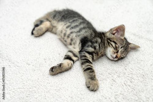 cute kitten tabby cat sleeping, resting, relaxing, looking on top of a bed. Cat sleep calm relax. Close up of the muzzle of a sleeping cat with closed and open eyes. Pets friendly and care concept.