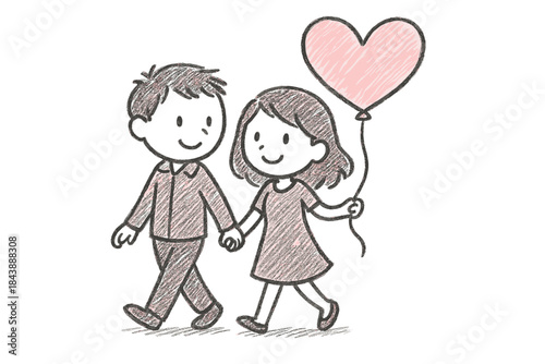 Cute sketch of a happy couple holding a heart balloon