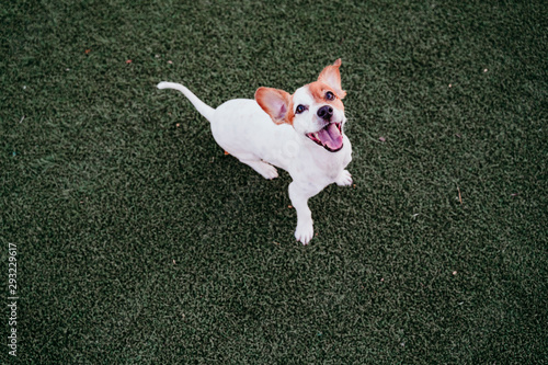 cute small jack russell terrier dog sitting outdoors ready to play. Happy dog at sunset. Pets outdoors