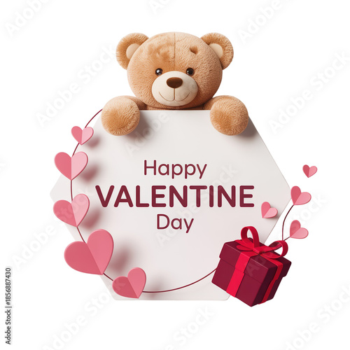 Cute Teddy Bear Holding Happy Valentine’s Day Sign with Pink Hearts and Gift Box on Black Background for Romantic Celebration