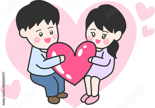 Cute Valentine Couple Holding Heart With Love You Lettering – Romantic Hand Drawn Cartoon Illustration