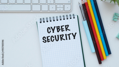 CYBER SECURITY text in a notebook on a desk with a computer keyboard and stationery, representing data protection, privacy, and digital safety concept.