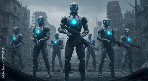 Cybernetic troops of tactical combat humanoid robots, preparing for urban warfare operations, background wallpaper.