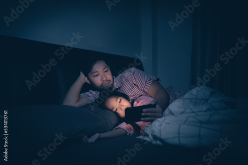 Dad and daughter sleep on the bed in bedroom,Watch cartoon with phone,Father day concept,Single dad,listen tale before sleep