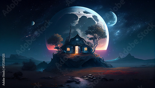Dark abandoned house in fantasy style. Halloween, Moon and space. AI generative content