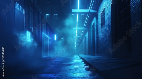 Dark Empty Street with Neon Blue Lights in Urban Setting at Night