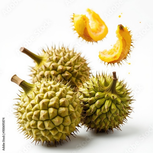 Delicious durian fruit with peeled yellow flesh flying in the air isolated on a white background