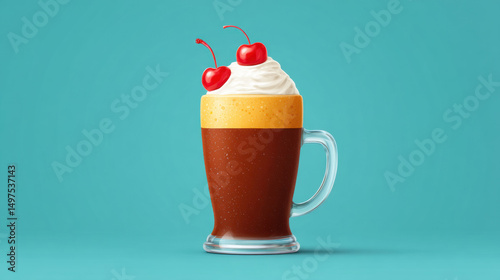 Delicious root beer float with vanilla ice cream in a clear mug against blue background