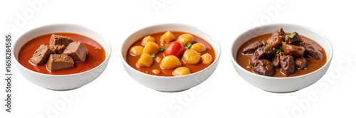 Delicious stews in white bowls featuring tender meat, colorful vegetables, and rich sauces create comforting meal experience