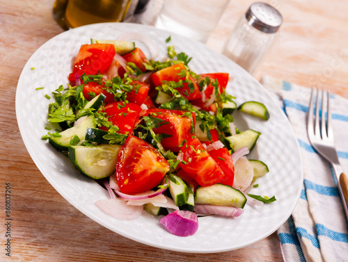 Delicious summer salad of cucumbers and tomatoes on a plate