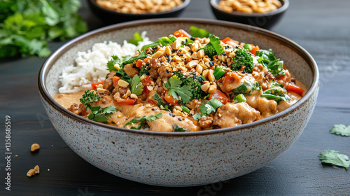 delicious vegetarian stir fry featuring vibrant vegetables, creamy peanut sauce, and rice