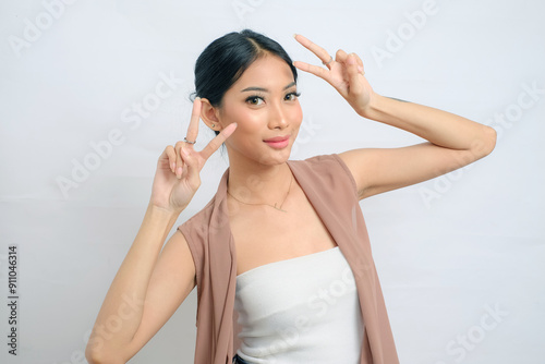 Delighted Asian Woman in Elegant Vest with White Background