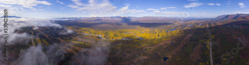 Denali and Alaska Range mountains and Alaska Route 3 aka George Parks Highway aerial view in fall, near Denali State Park, Alaska AK, USA.