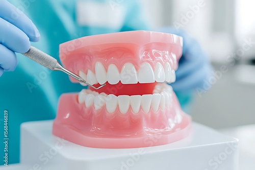 Dental hygiene demonstration using a plastic model of human teeth and gums with a dental tool to show patients how to clean their teeth properly.