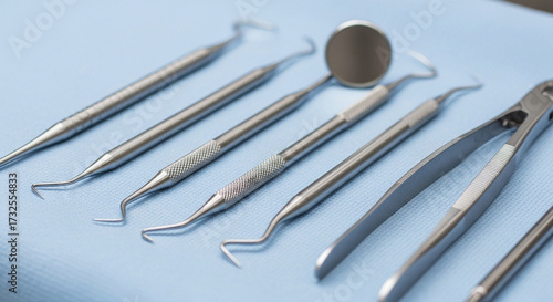 Dental Instruments on Light Blue Surface A Clean, Professional Dental Care Still Life