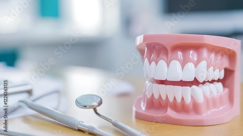 Dental model showcasing healthy teeth and gums on a dentist's table with tools and bright background