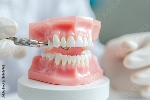 Dental model with surgical tool for demonstration, showcasing perfect white teeth and gums, used for educational or consultation purposes.