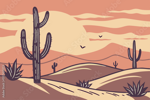 Desert Landscape Illustration with Cacti Sand Dunes and a Sunset Sky