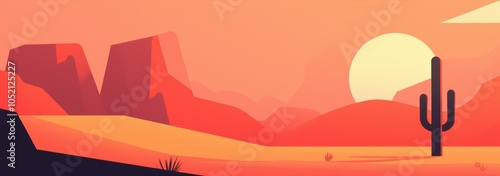 Desert landscape with a lone cactus and a brilliant sunset, casting long shadows on the sand