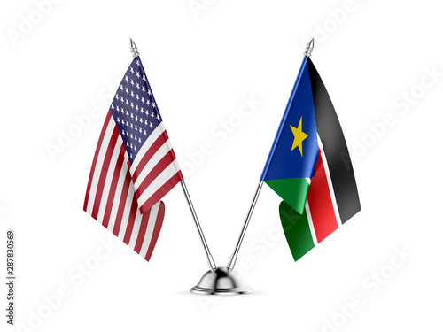 Desk flags, United States America and South Sudan, isolated on white background. 3d image