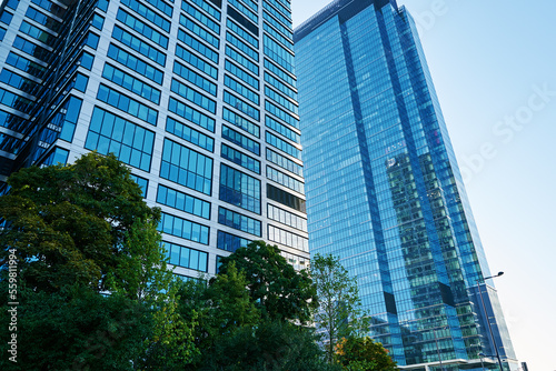 Detail of glass office building facade with reflections. Modern city architecture