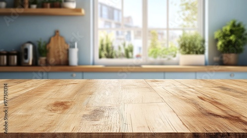 detailed shot of a kitchen counter background with a wood table top, capturing the essence of design and organization in home decor