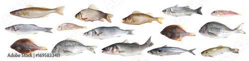 Different types of raw fish isolated on white, collage