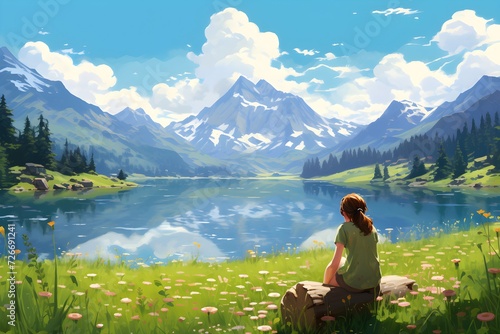 Digital anime style art painting of a man sitting with flowers in front of a beautiful lake