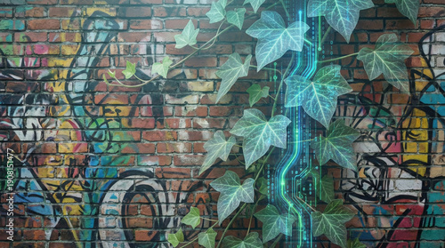 Digital circuit ivy growing on a colorful urban graffiti brick wall