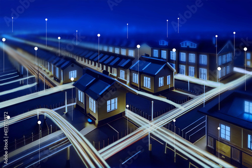 Digital community, smart homes and digital community. DX, Iot, digital network in society concept. suburban houses at night with data transactions, background with lots of light spots