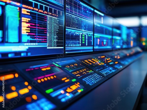 Digital control room in a modern factory, optimizing production lines for speed and quality