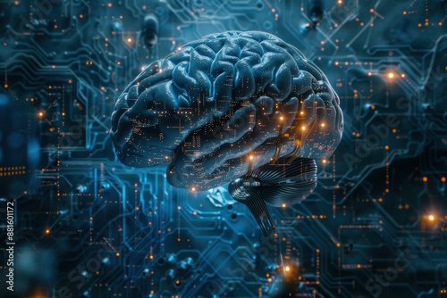 Digital illustration of a brain connected to a microcircuit and processor chip, symbolizing cyborg technology in the human body.