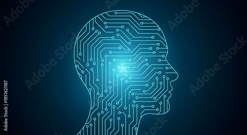 Digital silhouette of a human head filled with glowing blue circuit board lines, symbolizing artificial intelligence, machine learning, and technological thought.