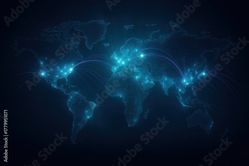 Digital world map with luminous nodes connecting continents futuristic global data network
