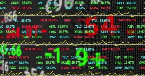 Displaying stock tickers and live percentage values on pixel grid monitor, with yellow trend lines