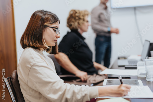 Diverse employees collaborate in an evening meeting, discussing ideas and strategizing for business growth and market expansion. Successful teamwork leads to profitability and sales for the company.