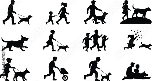 Diverse silhouettes of people and dogs enjoying activities together outdoors in various scenes
