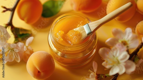 DIY apricot facial mask in jar with brush Organic spa treatment recipe with room for text