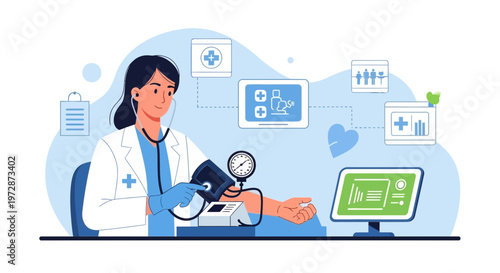 Doctor measuring patient's blood pressure with modern medical equipment and digital display